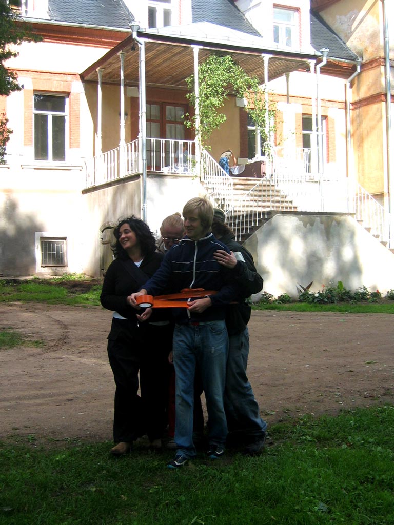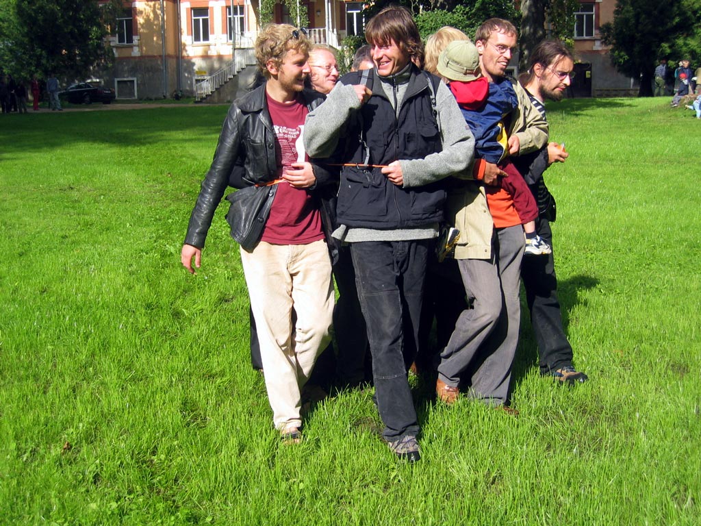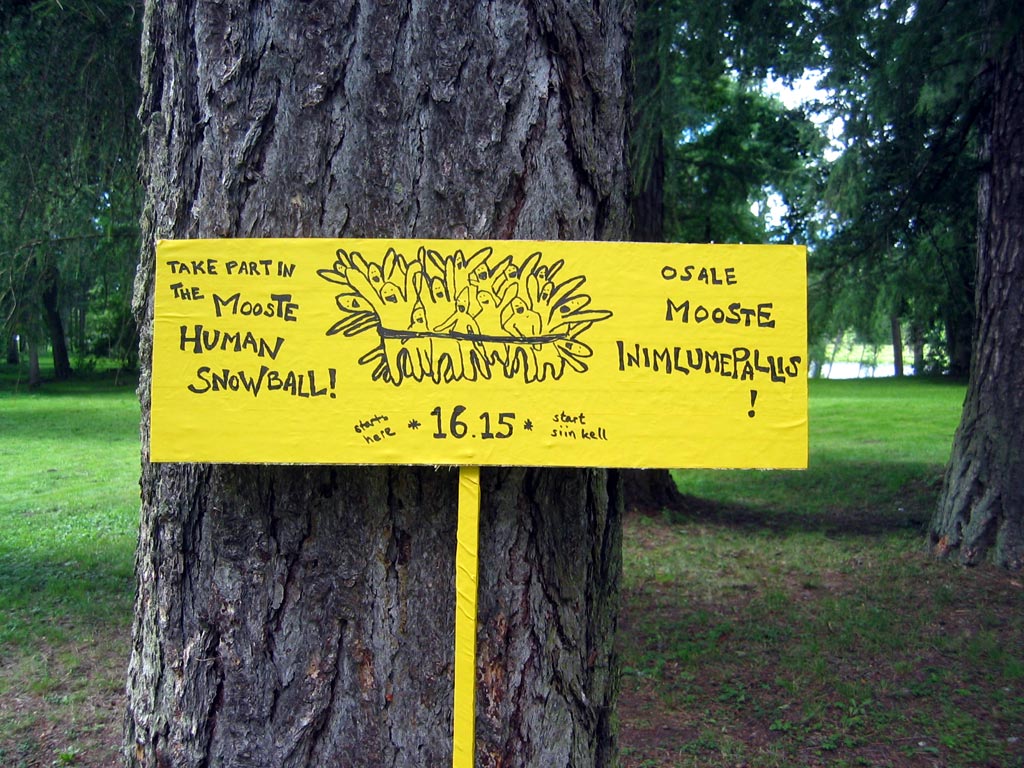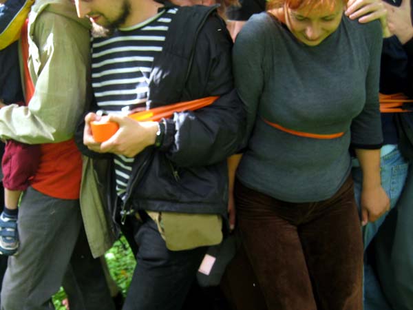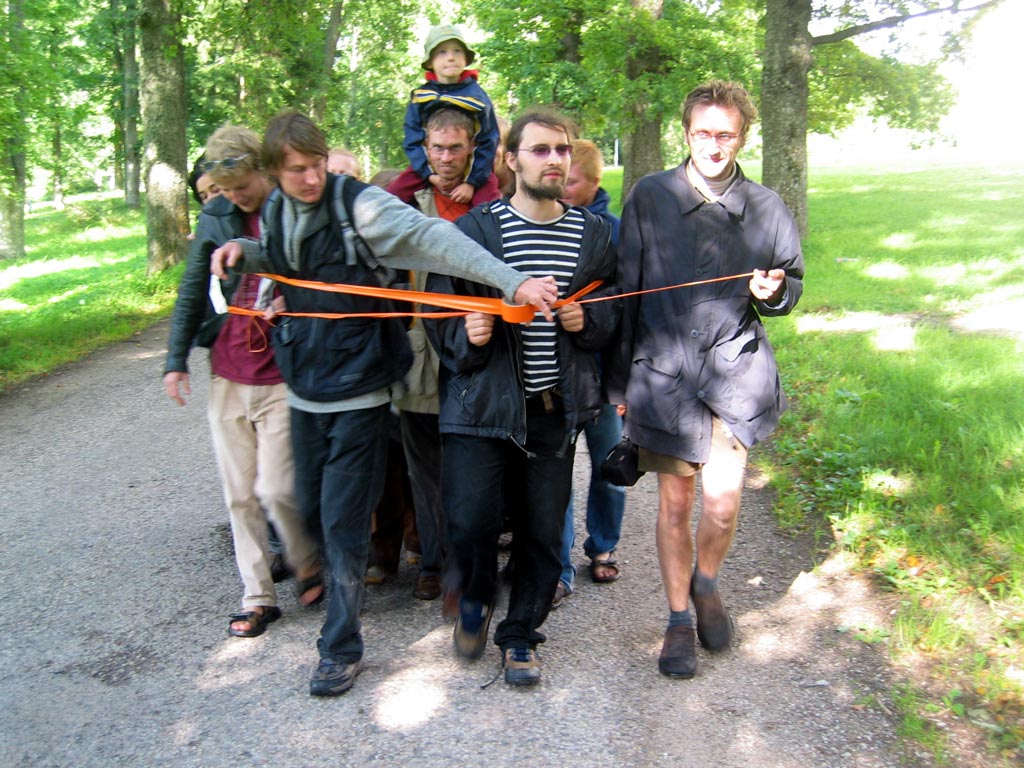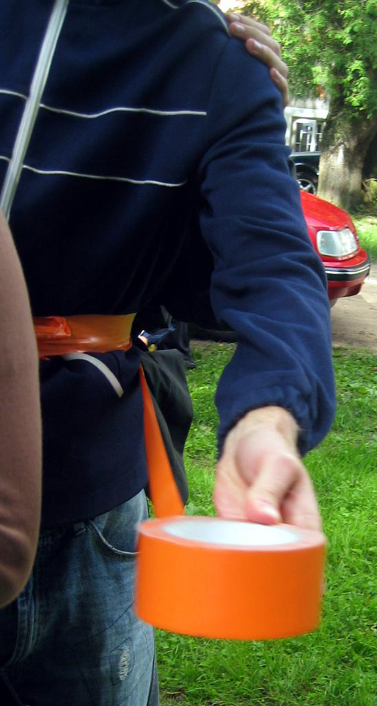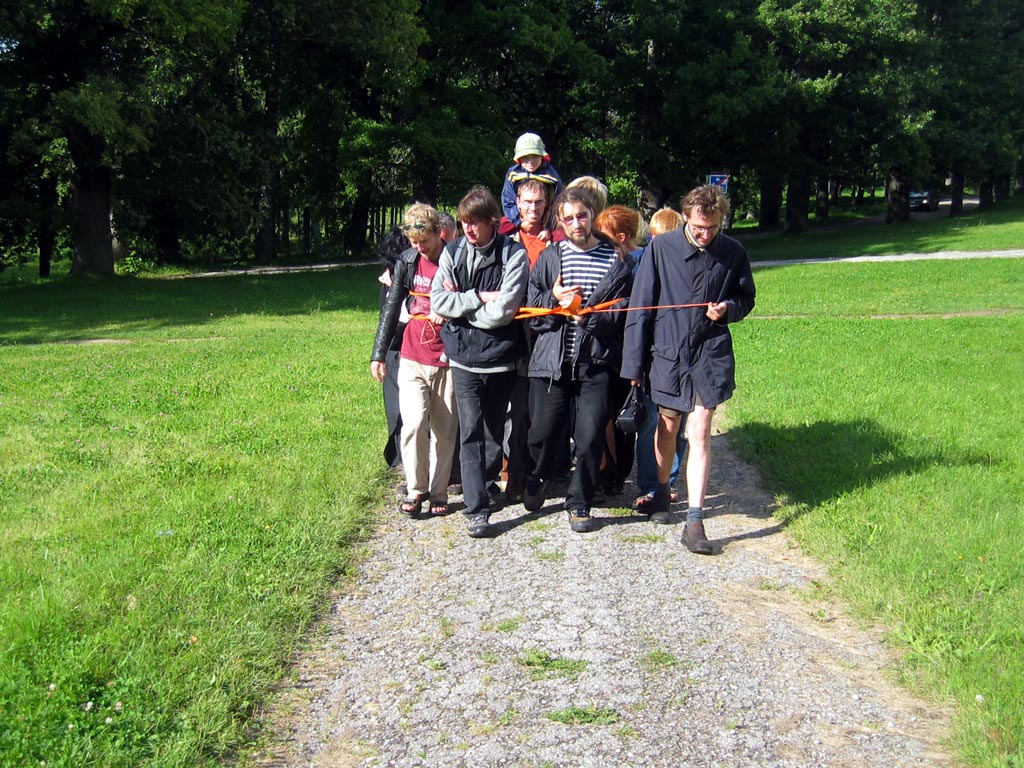 | The MOOSTE HUMAN SNOWBALL event took place August 22 in Mooste, a small post-kolkhoz town in rural south-eastern Estonia. Using sticky tape three people tied themselves together, then offering the tape for other people to join in. The 800 m walk took about twenty minutes. Innumerous toes were stepped on and more than fourty metres of bright orange, sticky tape was used. PHOTOS BY MARCUS WILLIAMS |