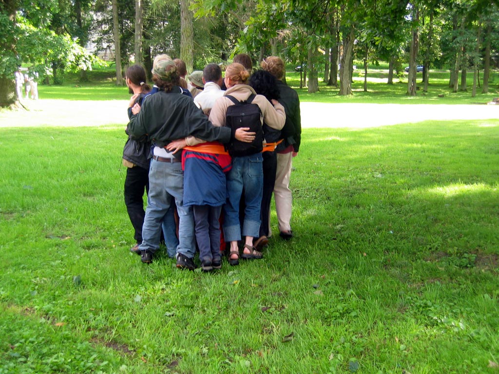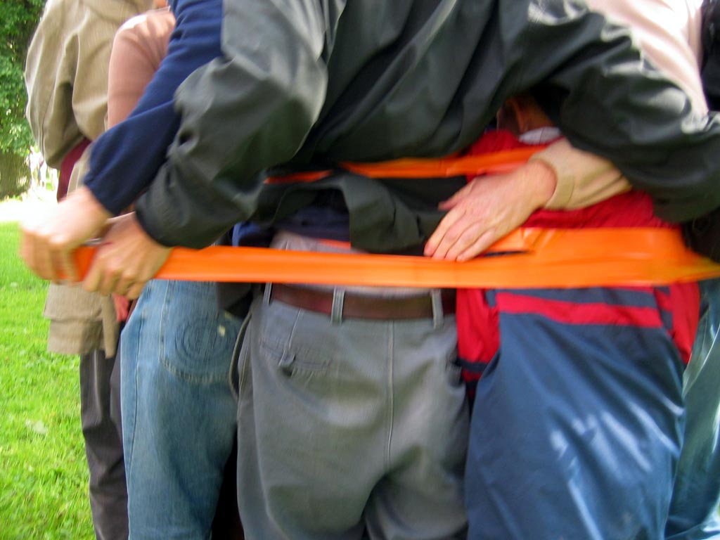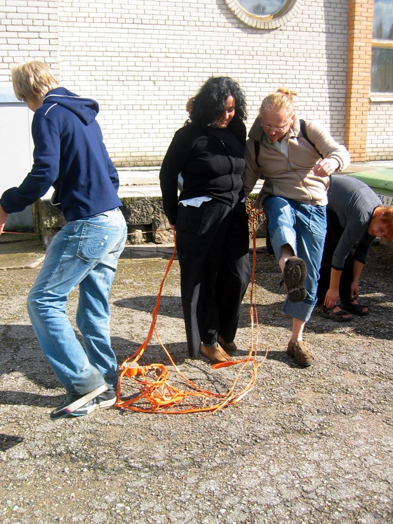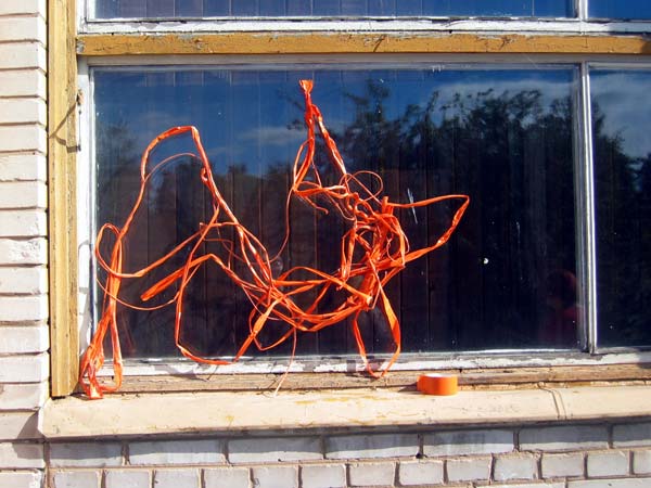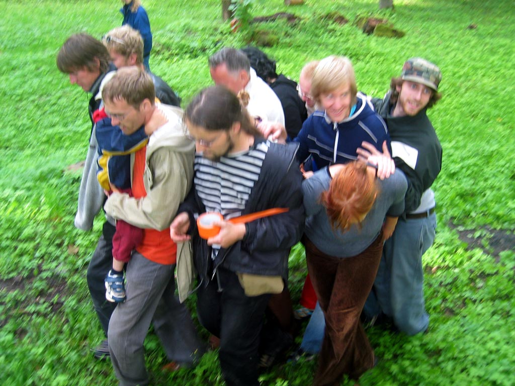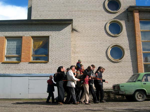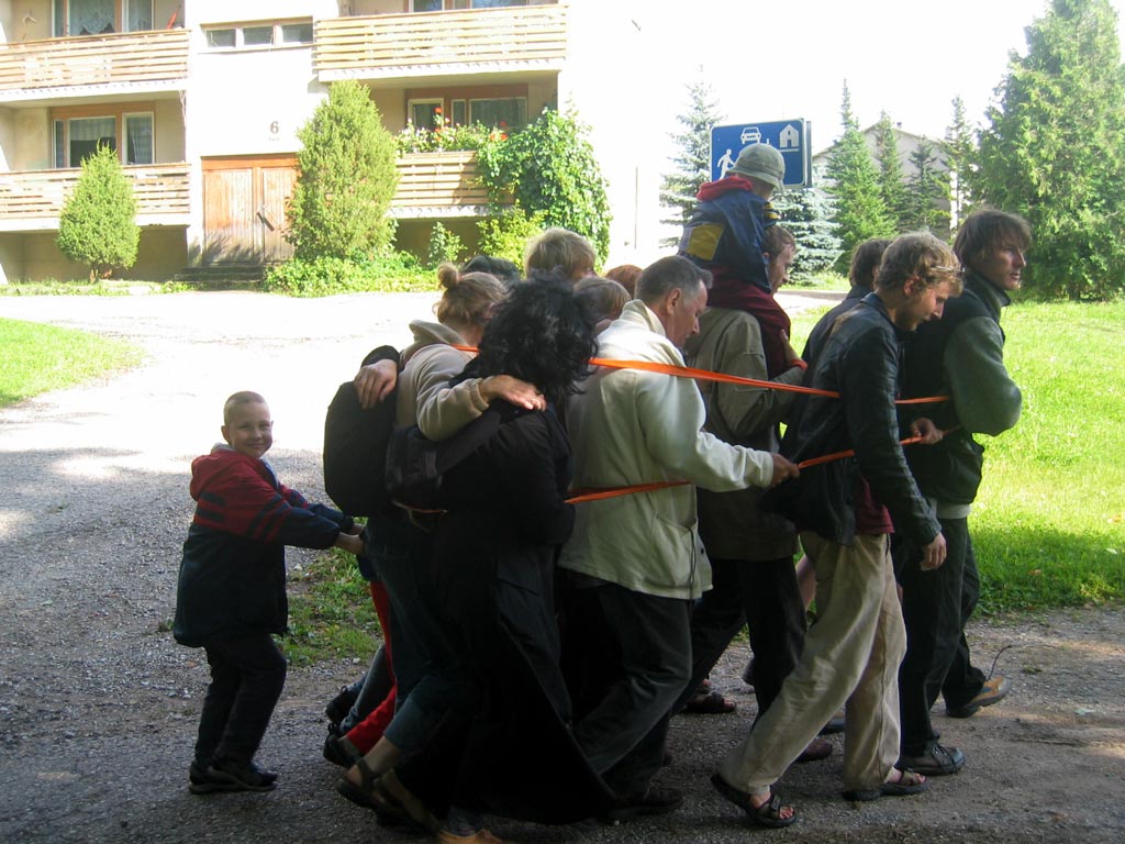 | The MOOSTE HUMAN SNOWBALL event took place August 22 in Mooste, a small post-kolkhoz town in rural south-eastern Estonia. Using sticky tape three people tied themselves together, then offering the tape for other people to join in. The 800 m walk took about twenty minutes. Innumerous toes were stepped on and more than fourty metres of bright orange, sticky tape was used. PHOTOS BY MARCUS WILLIAMS |
