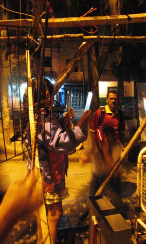 Setting up the installation in a wooden scaffolding used as a crib during Christmas celebrations